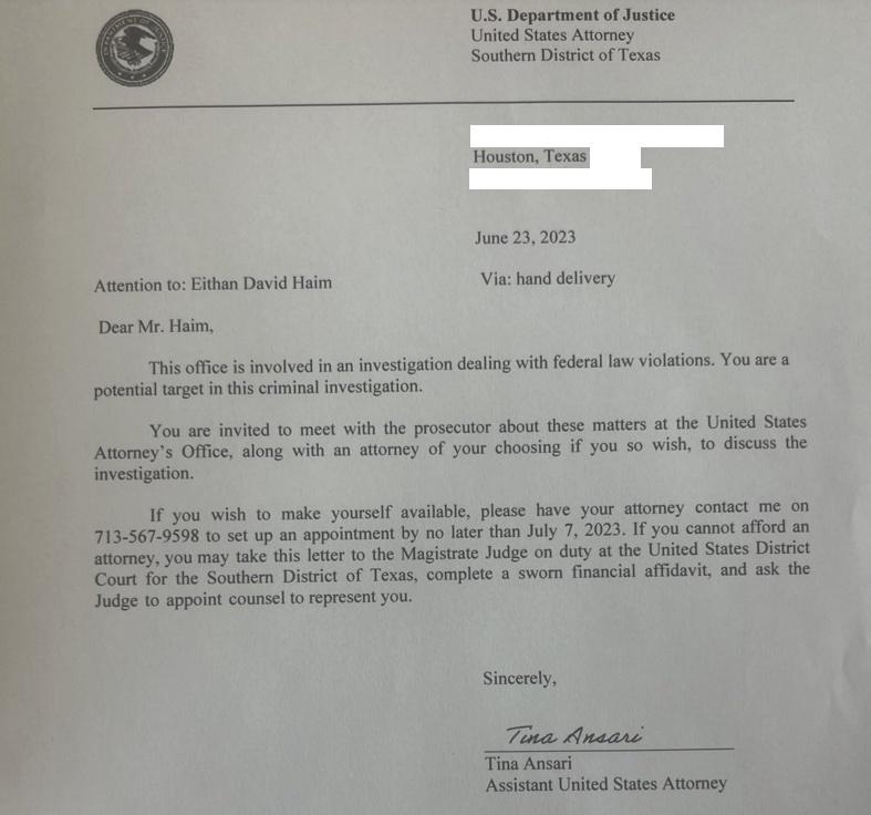 Haim declined to be interviewed by the agents who arrived at his apartment, opting to speak with an attorney prior to submitting to any interview. The target letter served to him by the agents and signed by the Assistant U.S. Attorney in the Southern District of Texas, Tina Ansari, made only vague statements about the investigation, though the agents said it had to do with “medical records,” according to Haim.