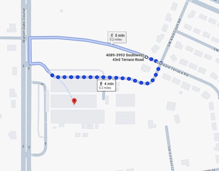 This is the distance between a typical house on 43rd Terrace Road and Sunrise Elementary School in Marion County, Florida.