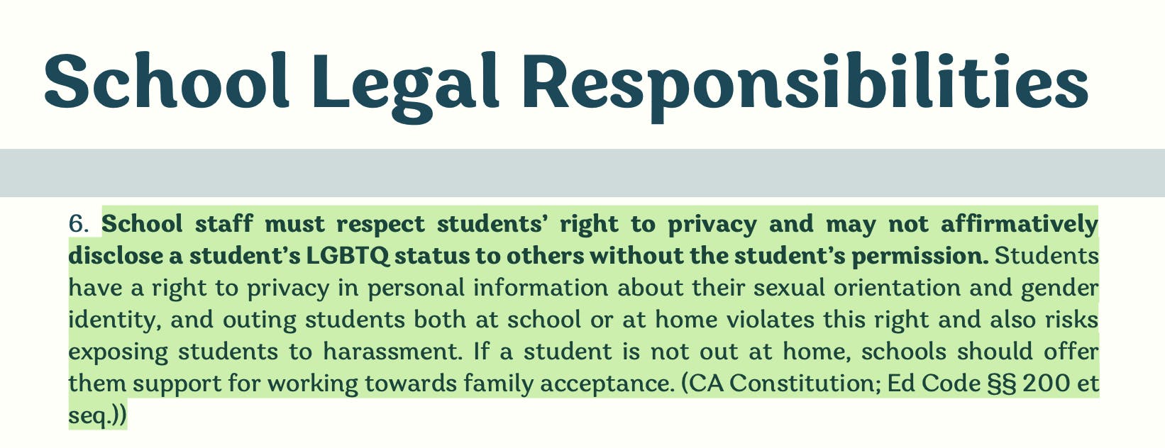 “School staff must respect students’ right to privacy and may not affirmatively disclose a student’s LGBTQ status to others without the student’s permission,” the guidance from the San Francisco-based LGBT organization says. “Students have a right to privacy in personal information about their sexual orientation and gender identity, and outing students both at school or at home violates this right and also risks exposing students to harassment. If a student is not out at home, schools should offer them support for working towards family acceptance.”