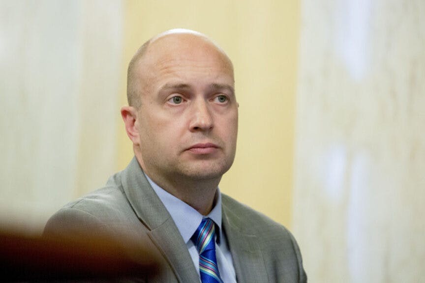 Scott Leiendecker, then the chief executive officer of KNOWiNK LLC, listens during a Senate Rules and Administration Committee hearing on election security in Washington, D.C. in 2018. Photographer: Andrew Harrer/Bloomberg via Getty Images