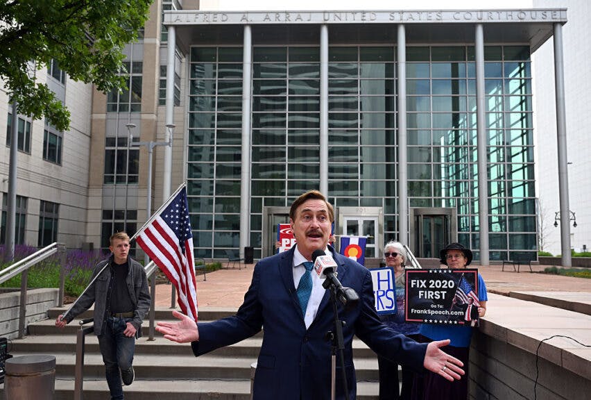 DENVER, CO – June 2: MyPillow CEO Mike Lindell holds a press conference outside the Alfred A. Arraj United States Courthouse in Denver, Colorado, on Monday, June 2, 2025. (Photo by Helen H. Richardson/MediaNews Group/The Denver Post via Getty Images)