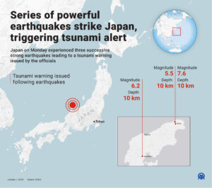 More than a dozen earthquakes were reported in the Sea of Japan late Monday night local time, the largest of which collapsed buildings and started a fire in Wajima, the city closest to the earthquake’s epicenter, Japanese news outlet NHK reported. According to The Washington Post, at least six people were “buried alive” under rubble when buildings collapsed, citing Japanese Chief Cabinet Secretary Yoshimasa Hayashi.