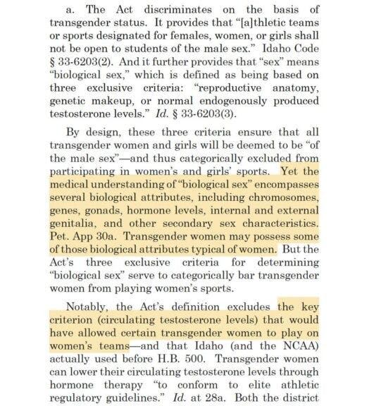 “The medical understanding of biological sex encompasses several biological attributes, including chromosomes, genes, gonads, hormone levels, internal and external genitalia, and other secondary sex characteristics. Transgender women may possess some of these biological attributes typical of women. … The Act’s definition [of biological sex] excludes the key criterion (circulating testosterone levels) that would have allowed certain transgender women to play on women’s teams.”