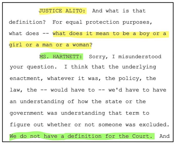 ALITO: “What is that definition, for equal protection purposes? What does it mean to be a boy or a girl, or a man or a woman?”