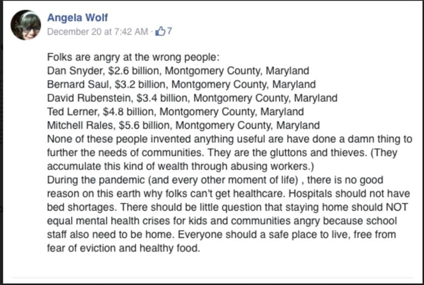 A Maryland teacher is on leave while the school system investigates her for a string of anti-Semitic social media posts that included creating a list of wealthy Jews in her county, claiming they horde wealth while contributing nothing to society, and calling for “class war.”