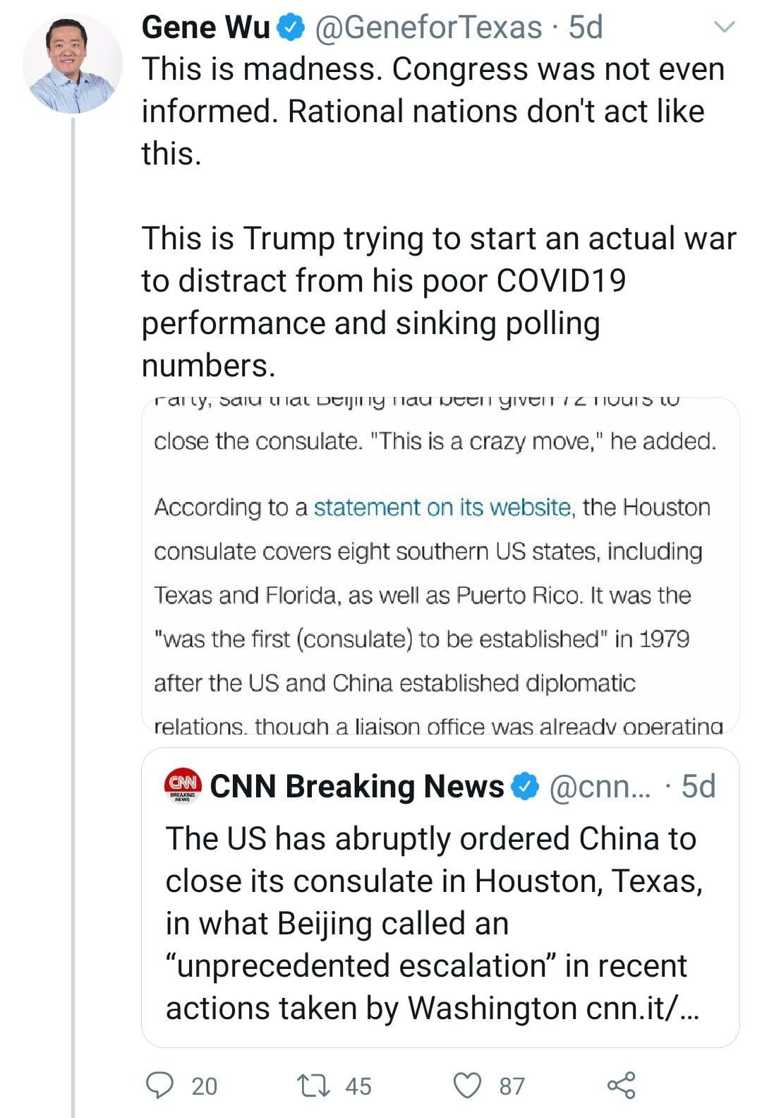For his part, Wu called the decision to close the consulate “madness.” He accused the president of trying to start World War III.