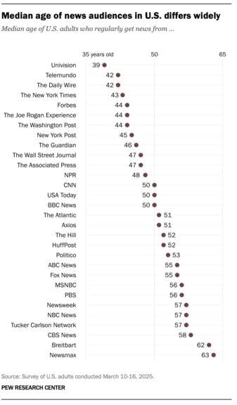 Younger Americans are also tuning out of cable and legacy networks, and turning toward digital-first platforms and independent thinkers. CNN lands at 50, well above the national adult median age of 47. CBS, NBC, and ABC all bring in folks in their late 50s.