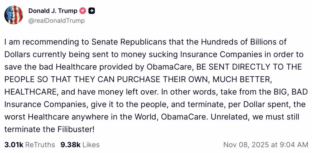 “I am recommending to Senate Republicans that the Hundreds of Billions of Dollars currently being sent to money sucking Insurance Companies in order to save the bad Healthcare provided by ObamaCare, BE SENT DIRECTLY TO THE PEOPLE SO THAT THEY CAN PURCHASE THEIR OWN, MUCH BETTER, HEALTHCARE, and have money left over,” he posted to Truth Social.