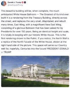 “This beautiful building will be, when complete, the much anticipated White House Ballroom — The Greatest of its kind ever built!” the president wrote on social media. “It is a rendering from the Treasury Building, directly across the street, and replaces the very small, dilapidated, and rebuilt many times, East Wing, with a magnificent New East Wing, consisting of a glorious Ballroom that has been asked for by Presidents for over 150 years.”