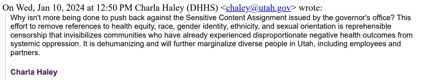 “Why isn’t more being done to push back against the Sensitive Content Assignment issued by the governor’s office?” the quote shared by Haley read. “This effort to remove references to health equity, race, gender identity, ethnicity, and sexual orientation is reprehensible censorship that invisibilizes communities who have already experienced disproportionate negative health outcomes from systemic oppression. It is dehumanizing and will further marginalize diverse people in Utah, including employees and Partners.”