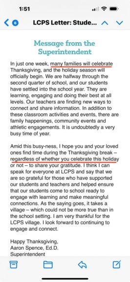 In a message to families, Loudoun County, Virginia Superintendent Aaron Spence wrote that this week, “many families will celebrate Thanksgiving,” and that, “Amid this busy-ness, I hope you and your loved ones find time during the Thanksgiving break — regardless of whether you celebrate this holiday or not — to share your gratitude.”