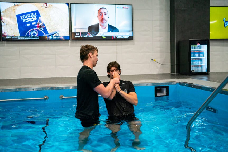 The Bible studies are held anywhere there’s room at the athletic complex, including team meeting rooms and locker rooms. The same goes for baptisms. Coach Drew has baptized so many of his players over his 23 years in Waco — sometimes right on the court — that the team now has a baptism wall honoring all the players who have dedicated themselves to Christ.