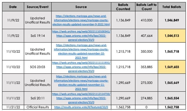 More from the filing: Maricopa County’s public statements concerning remaining ballots to be counted on November 9, 2022, and November 10, 2022, show an increase of approximately 25,000 votes with no explanation of why the number of remaining ballots could increase.