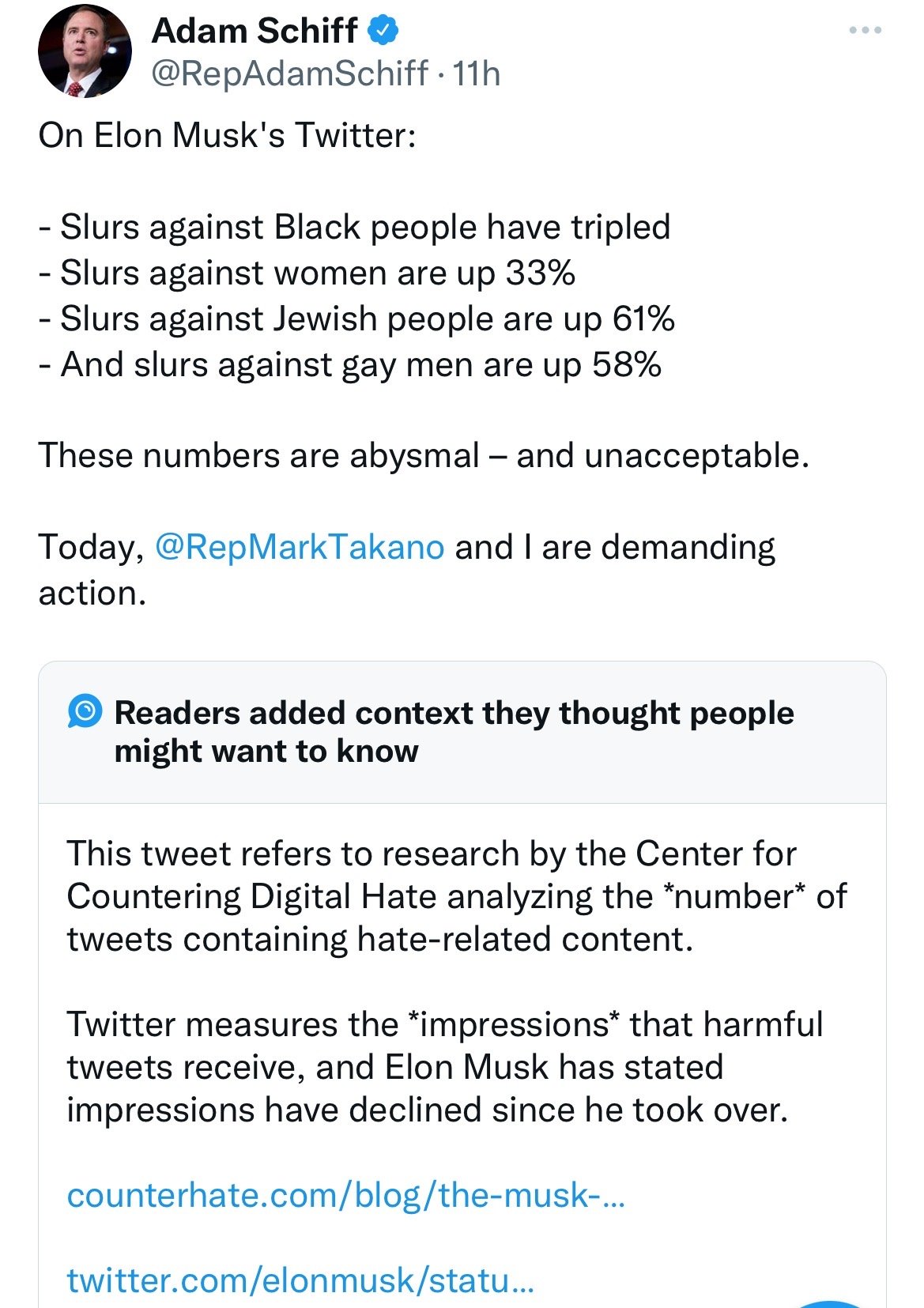 Schiff, without providing any evidence whatsoever, claimed slurs against blacks, Jews, women and gay men are up since Elon Musk took over Twitter.