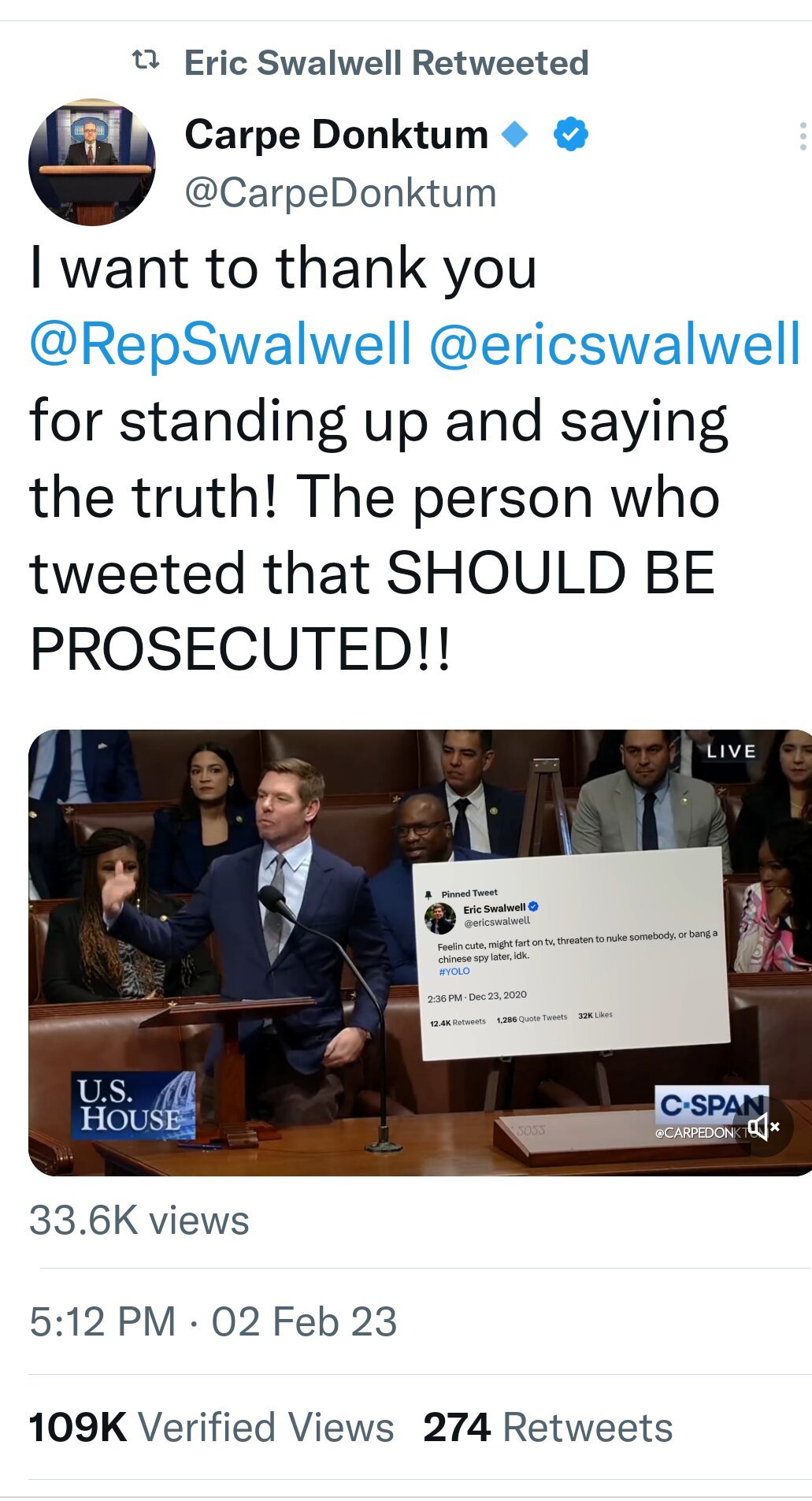 Carpe Donktum tweeted the video with a tongue-in-cheek message praising Swalwell for his speech, tagging Swalwell, “I want to thank you @RepSwalwell @ericswalwell for standing up and saying the truth! The person who tweeted that SHOULD BE PROSECUTED!!”