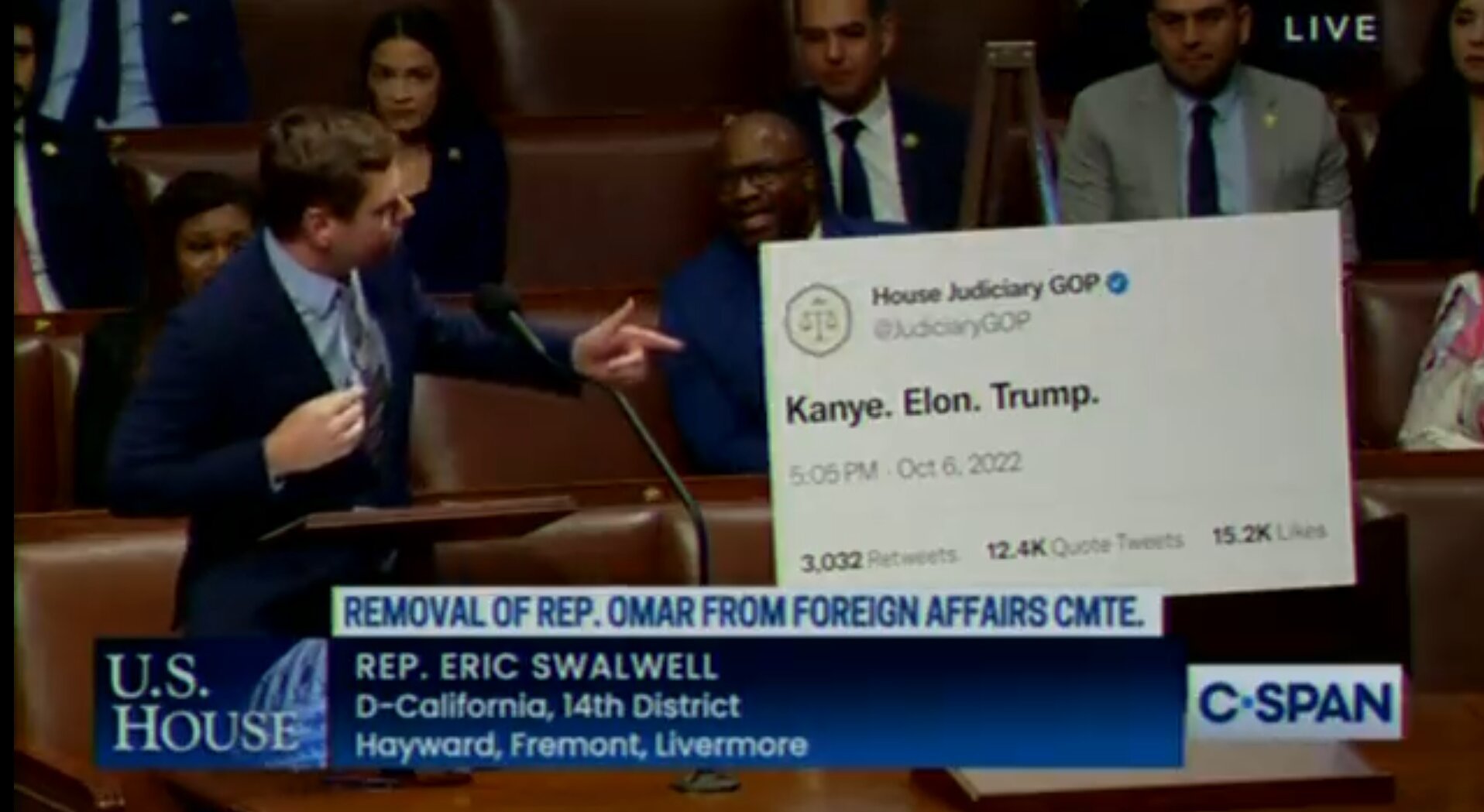 Swalwell stood next to an enlarged image of a tweet by the then minority Republicans on the Judiciary Committee posted last fall that read “Kanye. Elon. Trump.” Swalwell excoriated Rep. Jim Jordan (R-OH) for keeping the tweet up for two months after Kanye West had made anti-Semitic remarks.