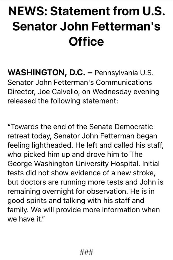 Previous statement by Fetterman’s office Wednesday evening that described him as being in “good spirits and talking with his staff and family.”