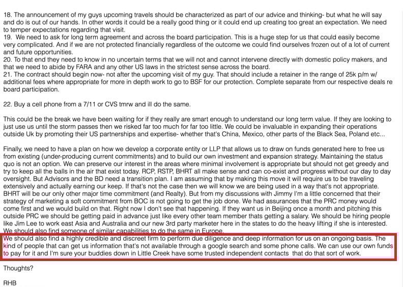 We should also find a highly credible and discreet firm to provide due diligence and deep information for us on an ongoing basis. The kind of people that can get us information that’s not available through a google search and some phone calls. We can use our own funds to pay for it and I’m sure your buddies down in Little Creek have some trusted independent contacts that do that kind of work.