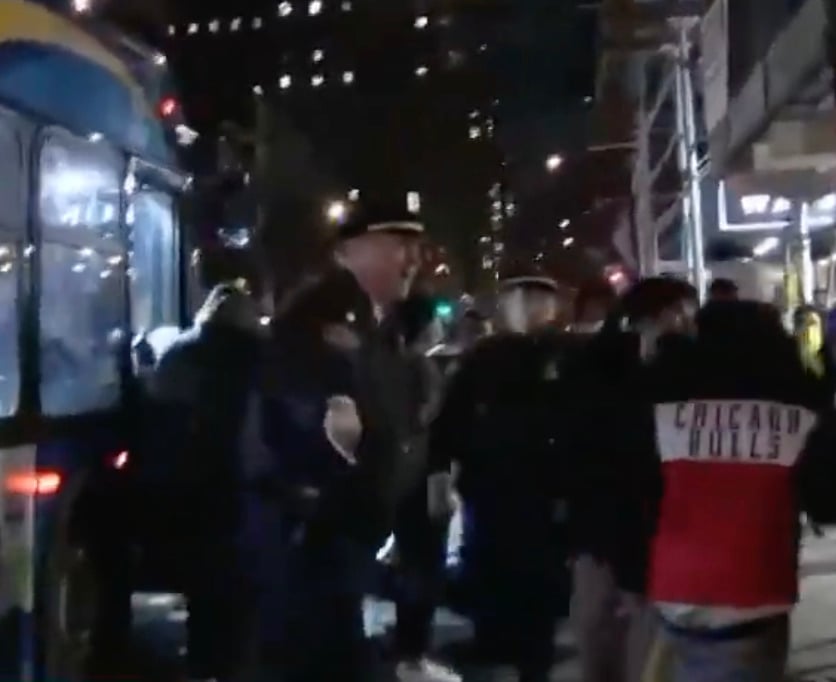 At one point, a city bus arrived and a small number of migrants jumped on, though the vast majority stayed put in front of the hotel on West 57th Street. Activists argued the migrants were being forced out of the hotel.