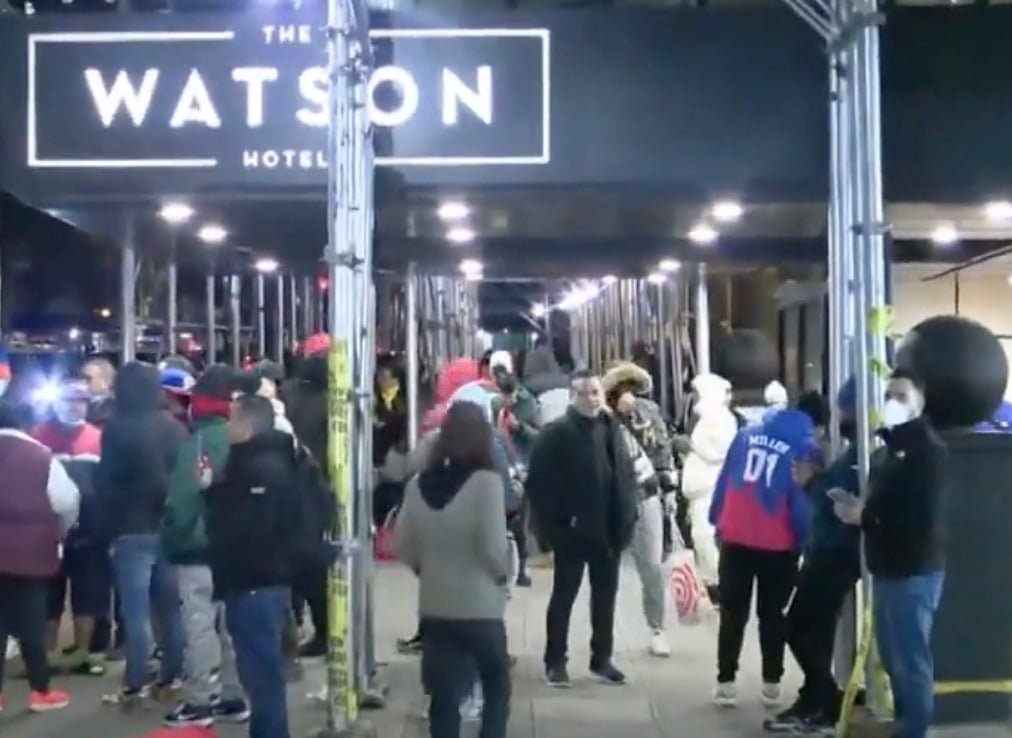 Dozens of migrants stood their ground outside the Watson Hotel in Hell’s Kitchen on Sunday night and refused to leave for a new shelter at the Brooklyn Cruise Terminal.