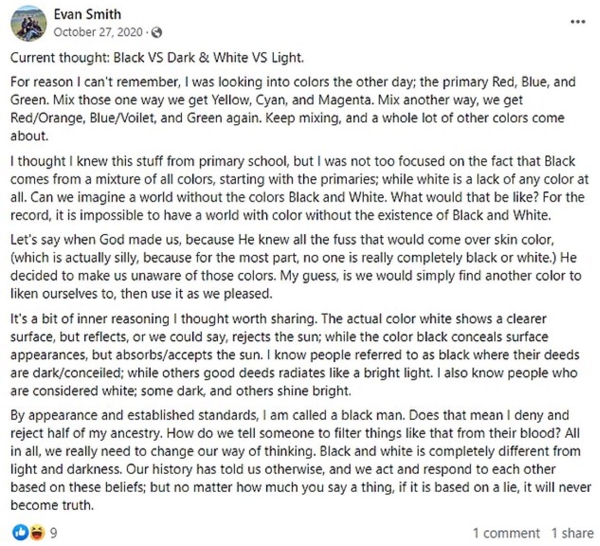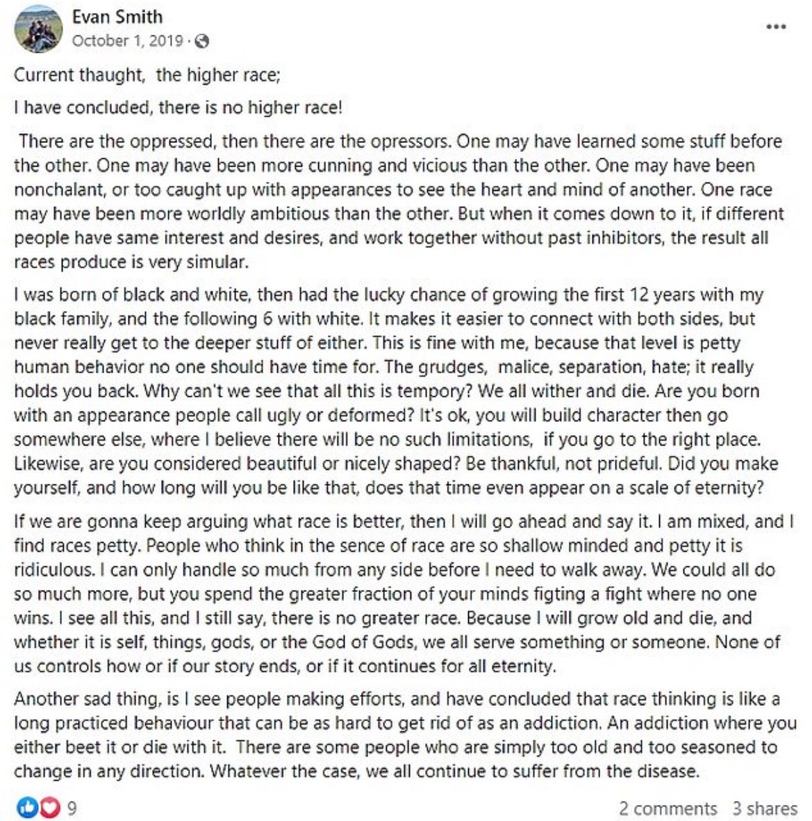 It turns out Vanroy Evan Smith previously ranted about race and ethnicity on Facebook.