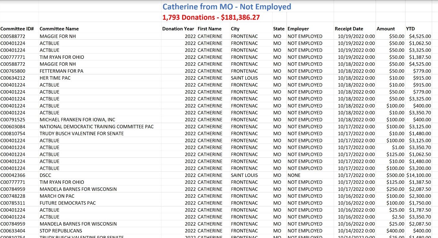 Chris also uncovered “Catherine in Missouri.” Catherine from Frontenac is also unemployed and made 1,793 donations totaling $181,386.27.