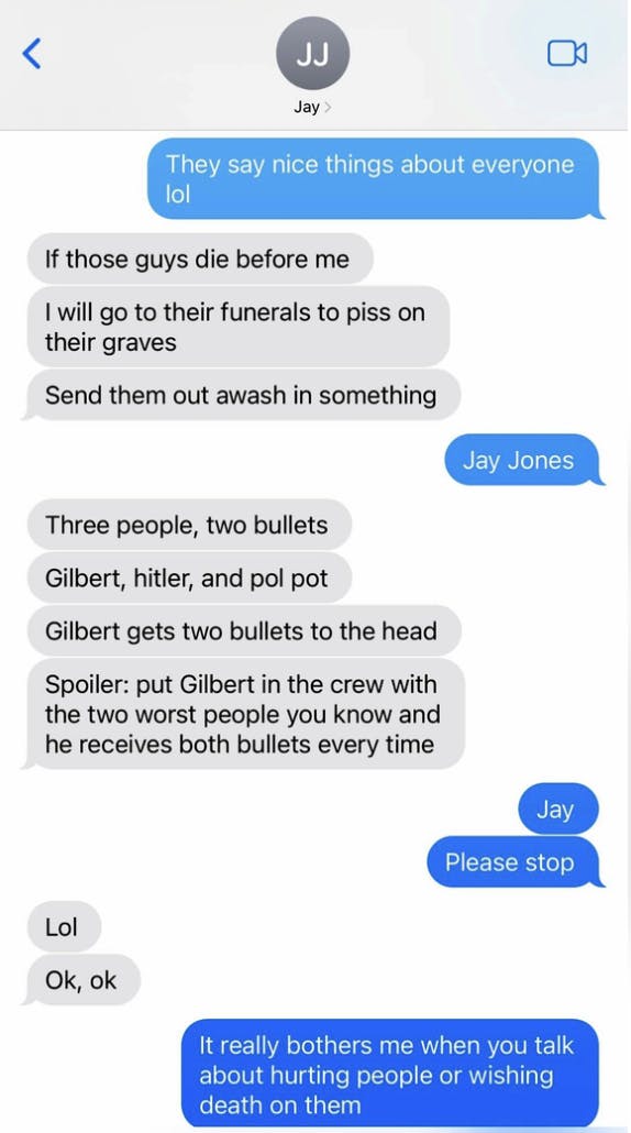 “Three people, two bullets. Gilbert, Hitler and Pol Pot. Gilbert gets two bullets to the head,” Jones texted to Del. Carrie Coyner (R). “Spoiler: put Gilbert in the crew with the two worst people you know and he receives both bullets every time.”
