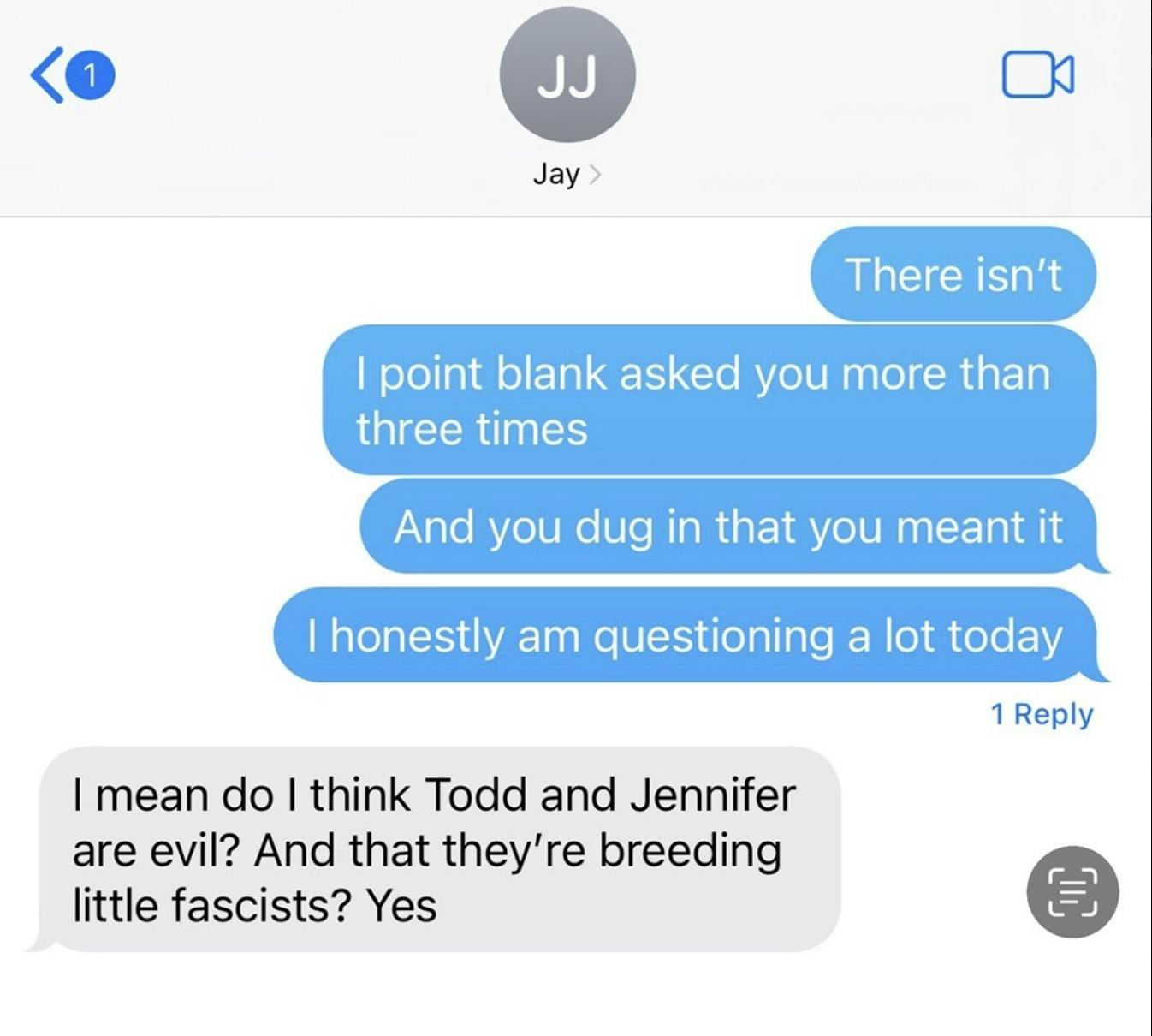 He added: “Do I think Todd and Jennifer are evil? And that they’re breeding little fascists? Yes.”
