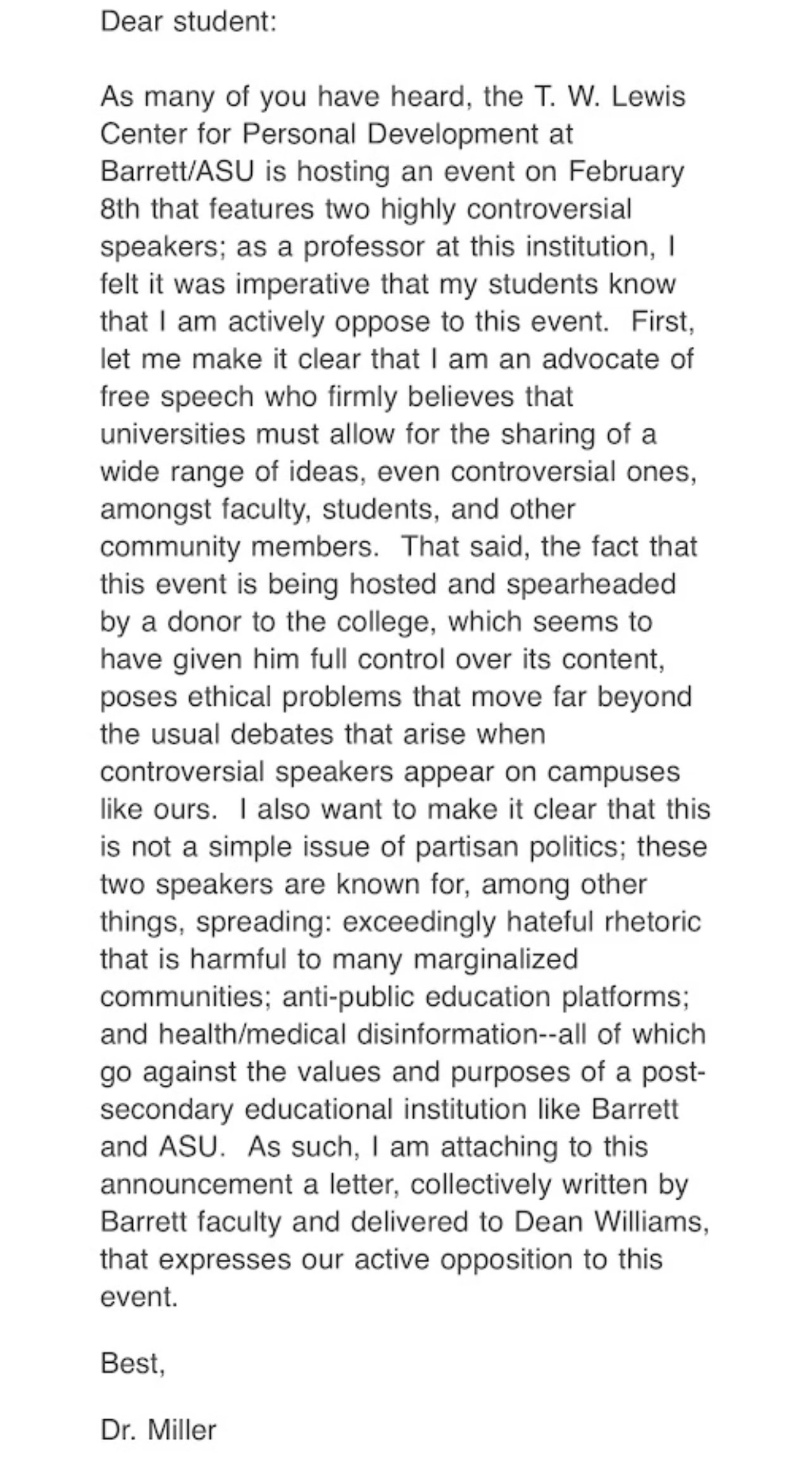 How are Barrett faculty meant to impress upon our students the value of an honors education when Barrett is promoting an event by the authors of If You Want to Be Rich and Happy, Don’t Go To School and The College Scam, who are advertising this event, ostensibly focused on personal development, as a chance for them to further their anti-intellectual agenda? What kind of impression does it girove our BIPOC students and potential students to see that during Black History Month Barrett is hosting two white nationalist provocateurs who have decried the social prohibition on using the n-word and called for the cancellation of Black History Month? How are Barrett faculty to provide a welcoming community for our LGBTQ students when we are hosting speakers who regularly employ anti-trans slurs on air and have suggested that gay people are incapable of thinking “as a person”? How can Barrett claim to prepare students for democratic citizenship when we are inviting speakers who regularly attack our democracy, promoting “the big lie” about the 2020 election, and, in the case of Kirk, pleading the fifth when questioned by congress about his role organizing the January Sixth Insurrection?We hope to hear from you soon regarding this urgently important matter. Our collective efforts to promote Barrett as a home for inclusive excellence demand that we distance ourselves from the hate that these provocateurs hope to legitimate by attaching themselves to Barrett’s name.